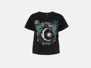 Twinset pamučna majica iz kolekcije Actitude ima okrugli ovratnik i kratke rukave. Ukrašena je cvjetnim motivom i motivom mjeseca.