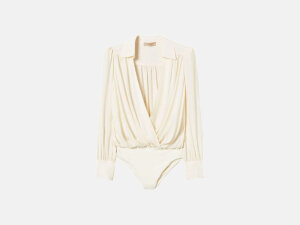 Bodi od krep de chinea s donjim dijelom od džerseja. Ima V-izrez s križanjem i nabiranjem, košuljasti ovratnik, duge rukave s manžetama te kopčanje na drukere.