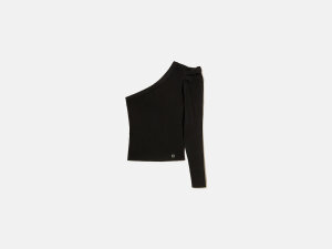 Džemper od mješavine viskoze iz kolekcije Actitude na jedno rame pripijenog je kroja i ukrašen metalnom pločicom s logotipom sa strane. Viskoza korištena za izradu ovog odjevnog predmeta (81% viskoza) dobivena je od recikliranog pamuka prije potrošnje.