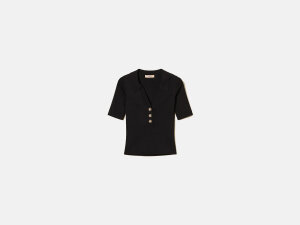 Polo majica od krep viskoze s ovratnikom, dubokim V izrezom i kopčanjem na gumbe s draguljima. Ima kratke rukave te ovalnu pločicu s T logotipom na leđima.