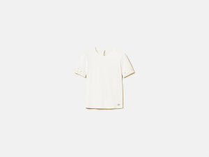 Pleteni džemper izrađen je od rastezljive viskoze s cirkonima na kraju rukava. Ima ovratnik s rolkom, kratke rukave te pločicu s ovalnim T logotipom na leđima.