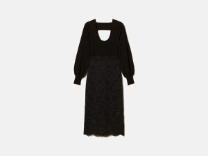 Midi haljina dolazi izrađena od rastezljivog viskoznog pletiva s donjim dijelom izrađenim od školjkaste čipke i obrubom koji ocrtava struk. Uskog je kroja. Ima široki ovratnik, duge "puf" rukave i skriveni bočni patentni zatvarač.