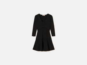 Kratka pletena haljina dolazi izrađena od rastezljive viskoze s rupičastim detaljima u struku. Ima široki ovratnik i duge rukave s nazubljenim rubovima.
