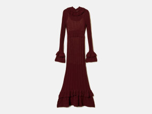 Duga haljina od mješavine pamuka s uzorkom okomitih šavova. Ima okrugli izrez, duge rukave s volanima na manžetama, otvor u obliku suze s gumbom na leđima te pločicu s ovalnim T logotipom.