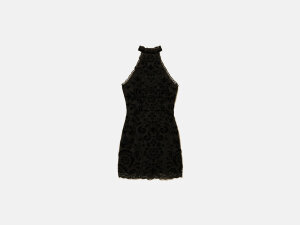 Kratka haljina od tila dolazi izvezena baroknim motivom od baršuna. Ima ovratnik s gumbima straga, bočno zakopčavanje patentnim zatvaračem, nazubljene rubove, duboki dekolte straga, podstavu te pločicu s ovalnim T logotipom straga.