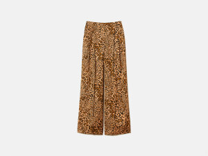 Hlače od žakard viskoze s životinjskim printom. Imaju prednje nabore, kose džepove, skriveni bočni patentni zatvarač te pločicu s ovalnim T logotipom. Širokog su kroja.