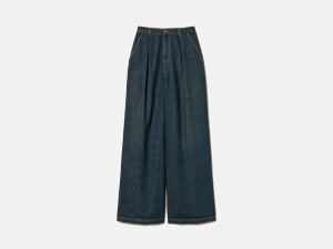 Plave, prebojane traperice širokog su kroja. Imaju omče za remen, kopčanje patentnim zatvaračem i gumbima s logotipom, prednje nabore te džepove s prorezima na stražnjoj strani.
