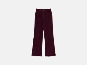 Hlače ravnog kroja od mješavine pamuka s patentnim zatvaračem i gumbom s oznakom brenda. Imaju pet džepova te pločicu s ovalnim T logotipom straga.
