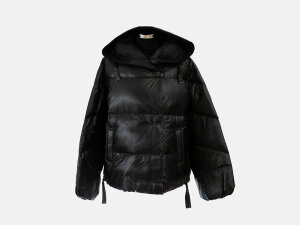 Jakna s prošivima i kapuljačom talijanskog branda Diego M izrađena je od poliestera, s dodatkom akrila i vune, punjena je perjem i paperjem. Ima dva bočna džepa. Kopča se skrivenim, dvorednim metalnim kopčicama (drukerima).