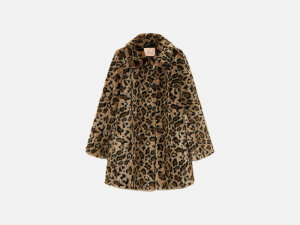 Kaput od žakardnog umjetnog krzna s životinjskim printom. Ima revere, kopčanje gumbima s logotipom, duge rukave, umetnute bočne džepove, podstavu. Ravnog je kroja.