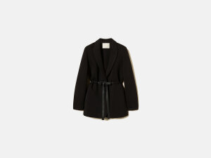 Sako ravnoga kroja s uzorkom od sjajne grosgrain vrpce koja se zateže u struku. Ima revere, duge rukave s izvezenim ovalnim T logotipom na kraju, kopčanje gumbima s logotipom te djelomičnu podstavu.