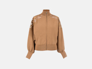 Jednobojna pletena jakna od mješavine viskoze s umetkom od organze s vezom. Ima rolkasti ovratnik, duge rukave te rebraste rubove. Kopča se patentnim zatvaračem.