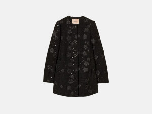 Kaput od buklé tkanine ukrašen je aplikacijama cvijeća i šljokica. Ima okrugli izrez, jednoredno kopčanje s prekrivenim gumbima, duge rukave, umetnute džepove, podstavu, pločicu s ovalnim T logotipom te ravan kroj.