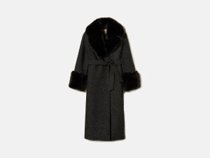 Dugi kaput ravnog kroja izrađen je od vunene tkanine s uzorkom, lureks koncem i odvojivim ovratnikom i manžetama od umjetnog krzna. Ima revere, dvostruko kopčanje na gumbe, duge rukave, umetnute bočne džepove, središnji prorez straga, odgovarajući remen, prošivenu podstavu te pločicu s ovalnim T logotipom straga.