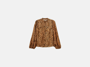Košulja od žakard viskoze ukrašena je životinjskim printom. Ima ovratnik s trakom, prekriveno kopčanje na gumbe, dugi rukavi s gumicom na kraju i šavom te ovalnu pločicu s T logotipom straga.