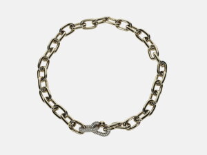 Ogrlica Furla Mianuvola s lancem ima dva isprepletena Arch logotipa, spojena metalnim biserima i ukrašena malim, svjetlucavim cirkonima. Zatvara se kopčicom.