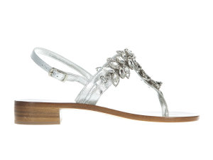 Sandale s malom potpeticom (2,5 cm) talijanskog branda Soleae izrađene su u potpunosti od kože. Prednja strana sandale istaknuta je kristalima. Kopčaju se tankim kožnim remenom s klasičnom kopčicom poviše pete.
