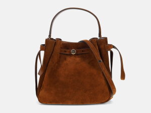 Torbica Romy Suede Bucket branda Tory Burch dolazi u dimenzijama 22x21,5x9,5 cm (d/v/š). Izrađena je od velur kože dok je podstava izrađena od umjetnog materijala. Torbica se zatvara magnetnom kopčicom. Ima dvije kratke ručke (maksimalna visina 12 cm), te još jednu dugu ručku za nošenje torbice preko ramena (maksimalna visina 50 cm).